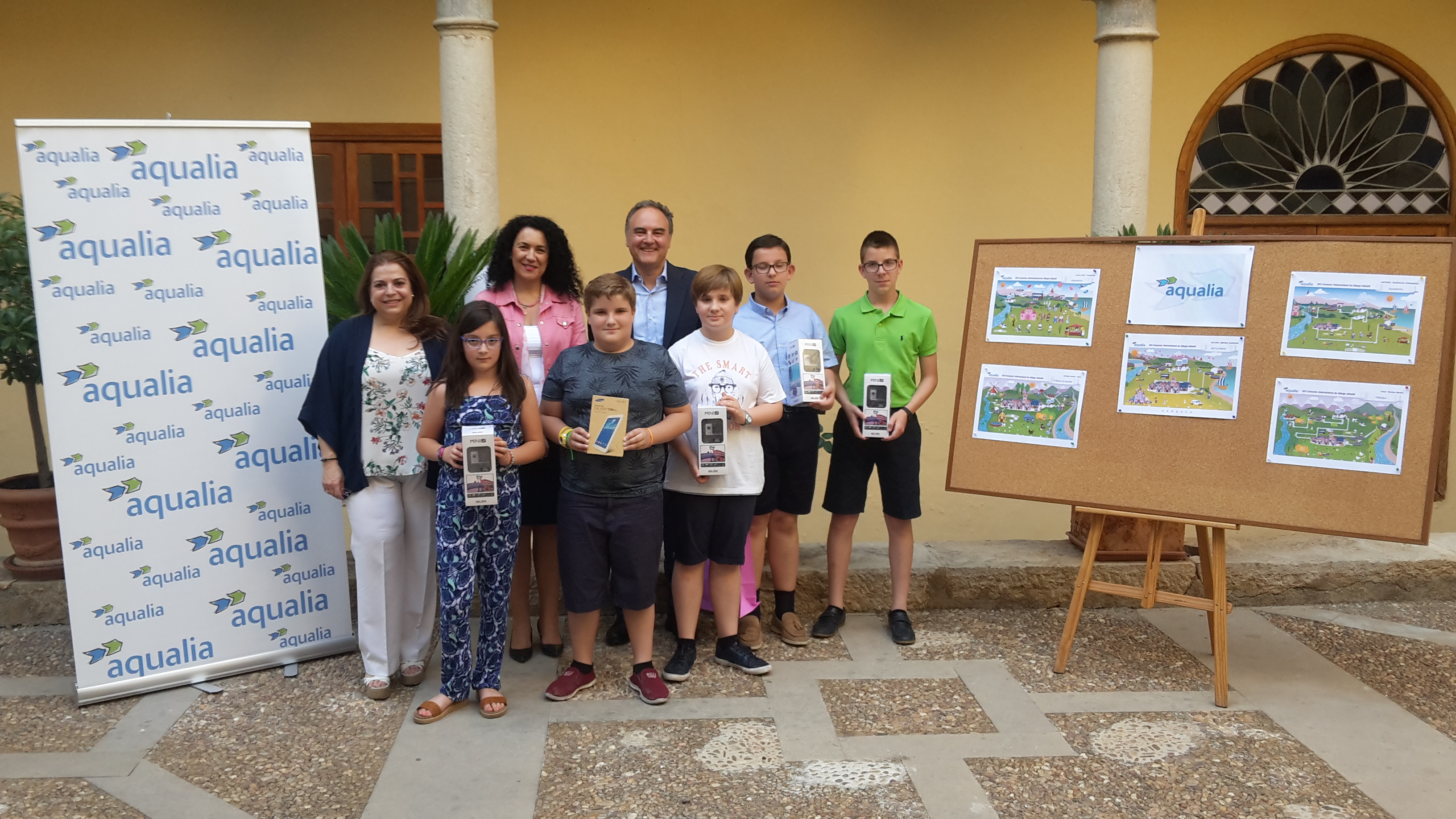 Cinco jóvenes alumnos de Jaén han recibido un premio de manos de la concejala de Educación, Mª Isabel Azañón, el Gerente de Aqualia en la ciudad, Juan Carlos Piñar, y la jefa de Gestión de Clientes, Anabel Ruiz, por sus trabajos presentados en el XIV Concurso Internacional de Dibujo Infantil, certamen que anualmente c...