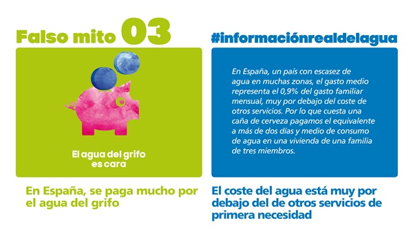 El tercer mito de la Campaña de Aqualia sobre la información real en torno a la Gestión Integral del agua gira en torno al precio, aportando una serie de datos que permiten valorar lo que se paga por el agua del grifo en España y su incidencia en el presupuesto familiar en comparación con otros productos y servicios.
