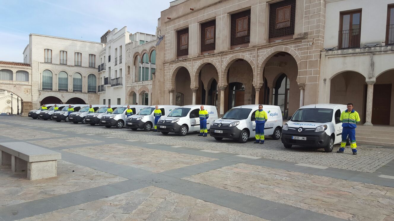 El Ayuntamiento de Badajoz y Aqualia, empresa gestora del Servicio Municipal de Agua en la ciudad, han presentado hoy en la Plaza Alta los vehículos eléctricos que se han incorporado a la flota del servicio.