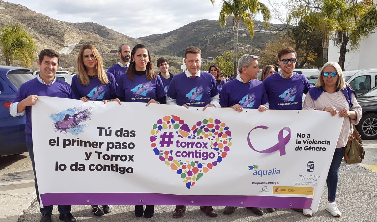 Los municipios en los que Aqualia presta servicio se han volcado en la organización de diferentes acciones para mostrar su repulsa a esta lacra social. Un ejemplo de ello lo encontramos en Torrox (Málaga), donde han hecho suya la campaña #aqualiacontigo. Bajo el lema “Tú das el primer paso y Torrox lo da contigo”, más de 500 vecinos y escolares del municipio han salido a la calle para participar en una marcha liderada por el alcalde la localidad, Óscar Medina, la concejala de Igualdad, Verónica Muñoz, y el director de la delegación Andalucía II de Aqualia, Francisco Jiménez. A la llegada a la plaza del Ayuntamiento, los escolares han protagonizado un acto simbólico con la lectura de un manifiesto, poesías y frases de rechazo a la violencia de género y en recuerdo a las mujeres que han sido víctimas durante 2019. En Torrox, además, Aqualia tiñó de morado el agua de la fuente de la plaza, que se puso en funcionamiento como símbolo de vida.