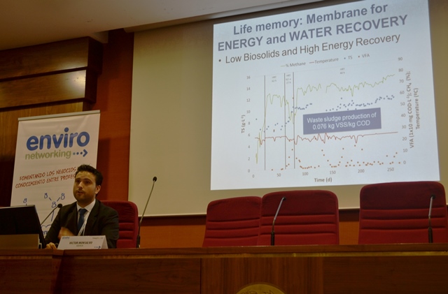 Victor Monsalvo, Jefe del Área de Eco-Eficiencia del Departamento de I+D de Aqualia ha presentado “Del fango al biocombustible y otras vías de recurso circular en depuración”. La ponencia ha incluido una síntesis de varios proyectos de I+D de Aqualia relacionados con la gestión eficiente de fangos y su reutilización en el ámbito de los biocombustibles y biofertilizantes (LIFE Memory, LIFE iCirBus, LIFE Answer, SMART Green Gas y All-gas).