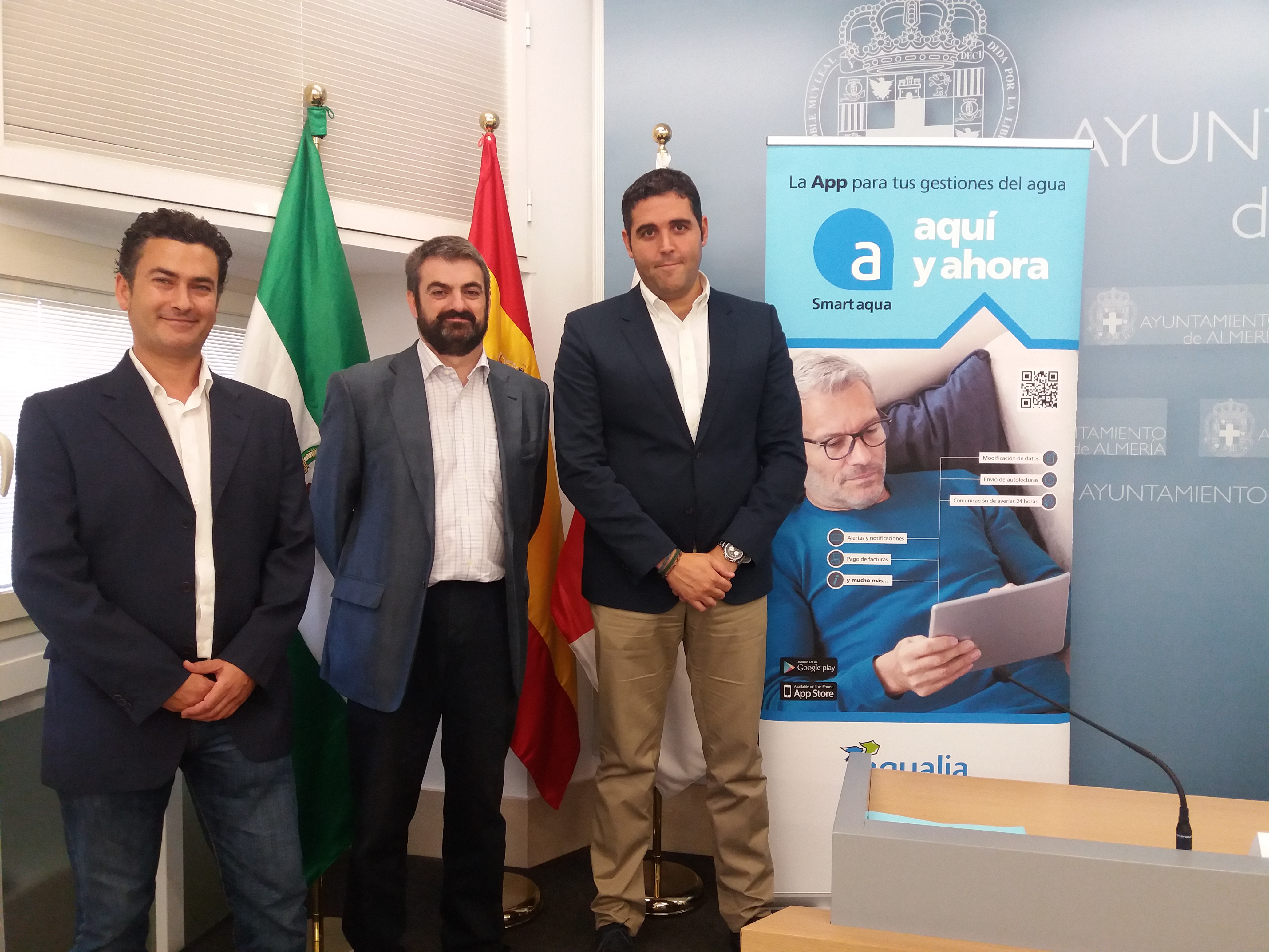 Aqualia, empresa responsable de la gestión del agua en Almería, ha presentado esta mañana Smart Aqua, la aplicación para dispositivos móviles, Android e IOS, gratuita y desarrollada para ofrecer el servicio más completo a los ciudadanos. Al acto han asistido Juan José Alonso, Teniente Alcalde de Servicios Municipales, José V. Colomina, gerente de Aqualia en la ciudad, y Alejandro Jurado, del departamento de Gestión de Clientes de la empresa.
