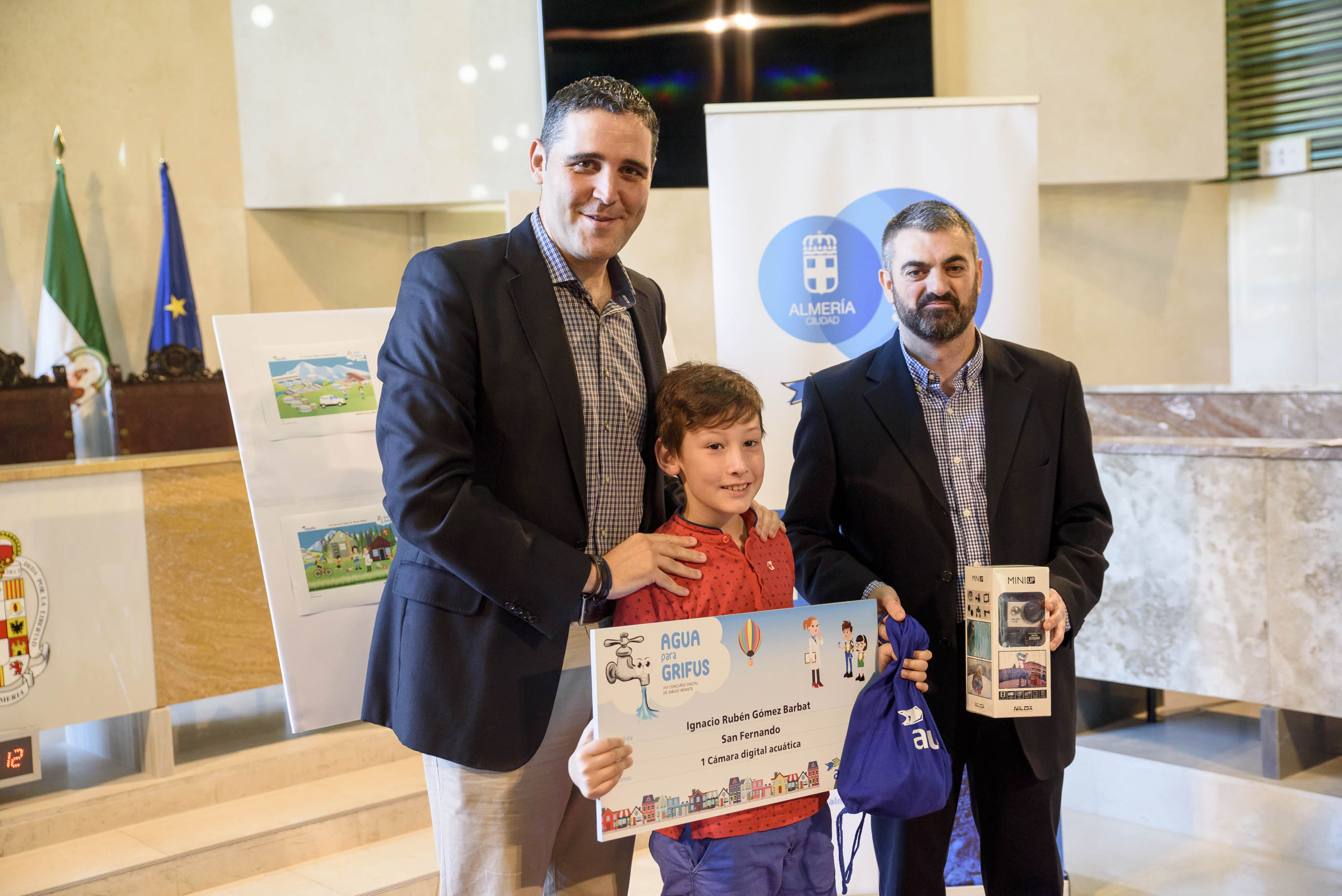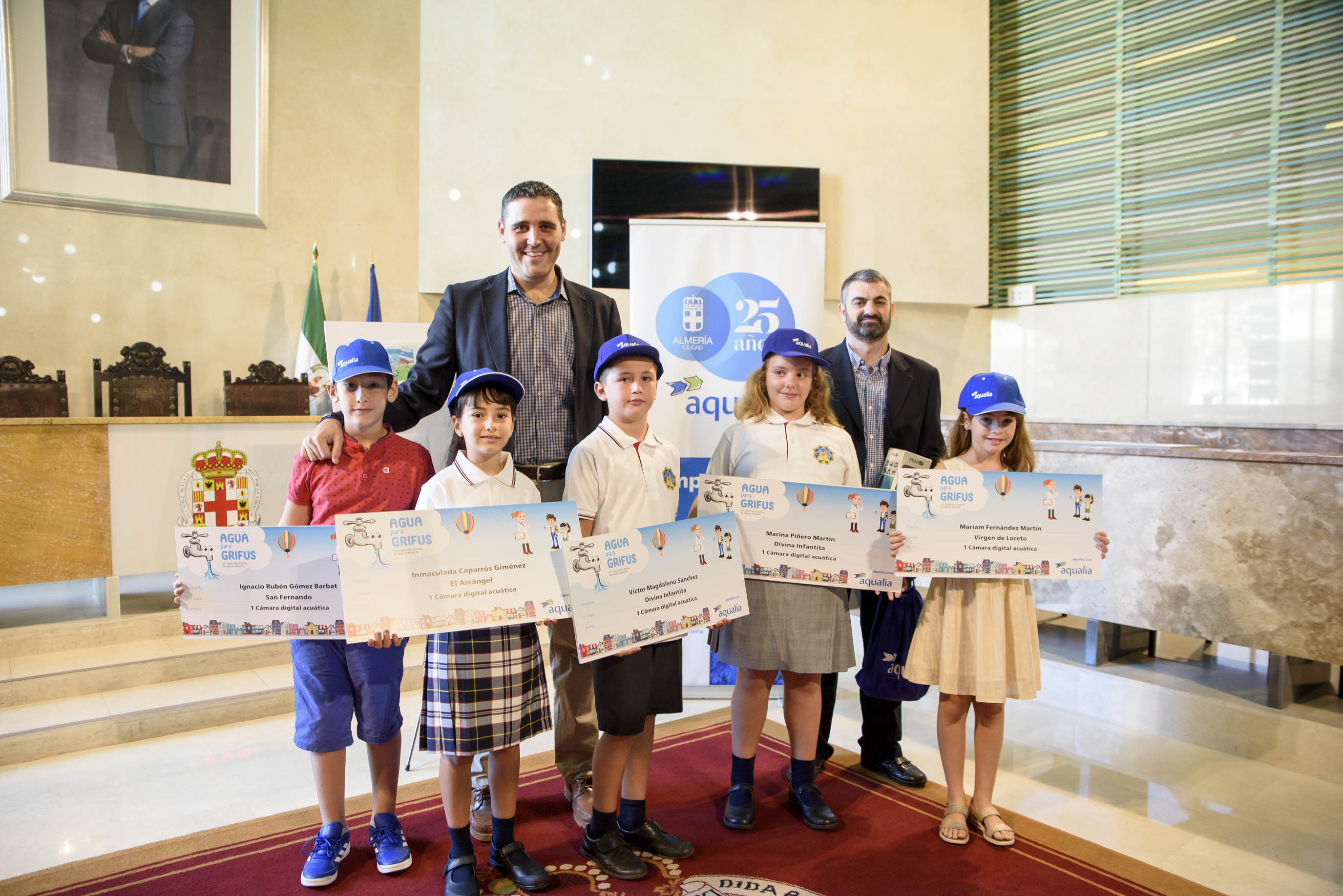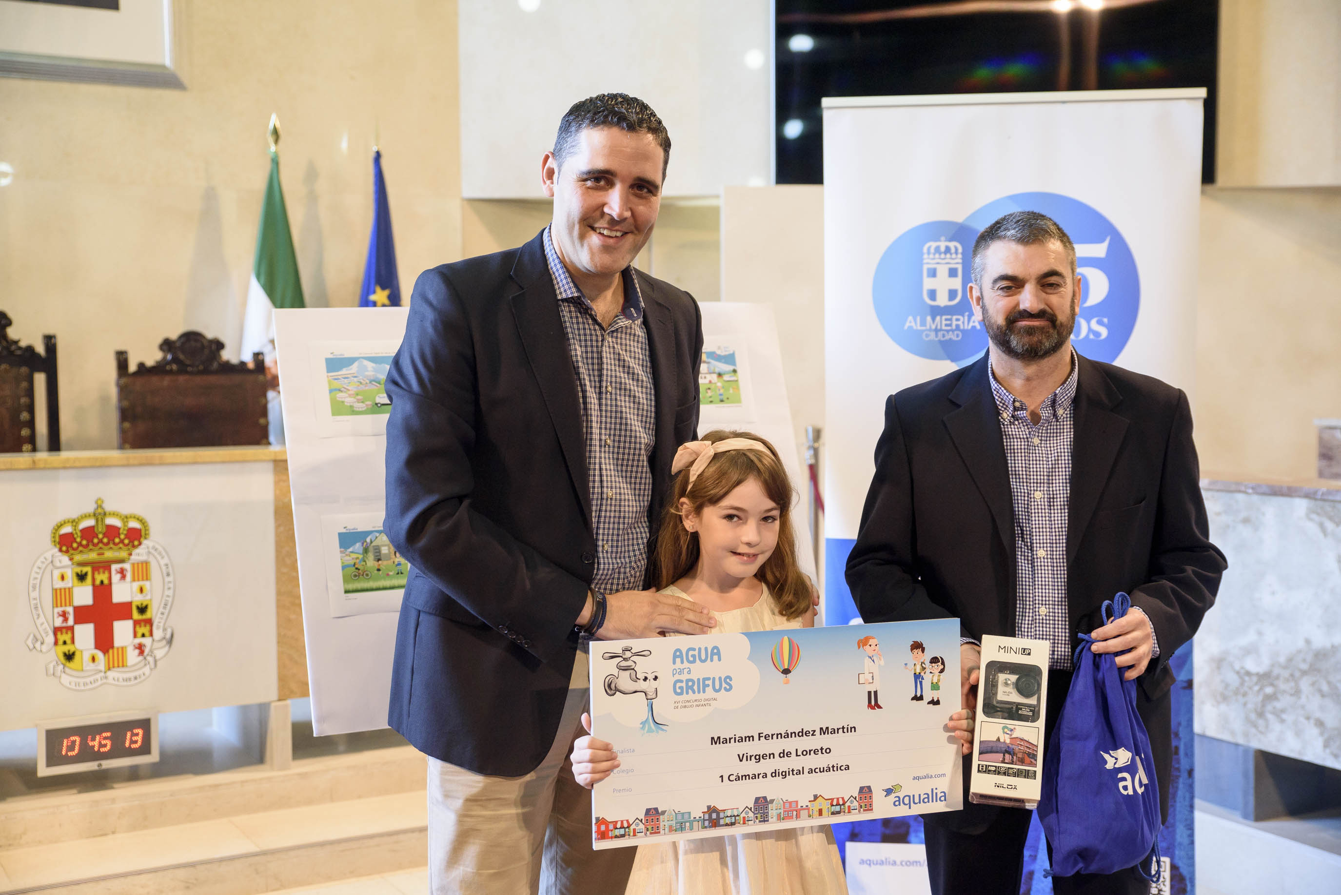 El concejal de Servicios Municipales de Almería, Juan José Alonso, y José V. Colomina, gerente de Aqualia en la ciudad, han hecho entrega esta mañana de los premios correspondientes a la 16ª Edición del Concurso Digital Infantil que la empresa ha lanzado este año en torno al microsite www.aguaparagrifus.com con la intención de poner en valor el trabajo que representa llevar el agua desde la naturaleza hasta el grifo.