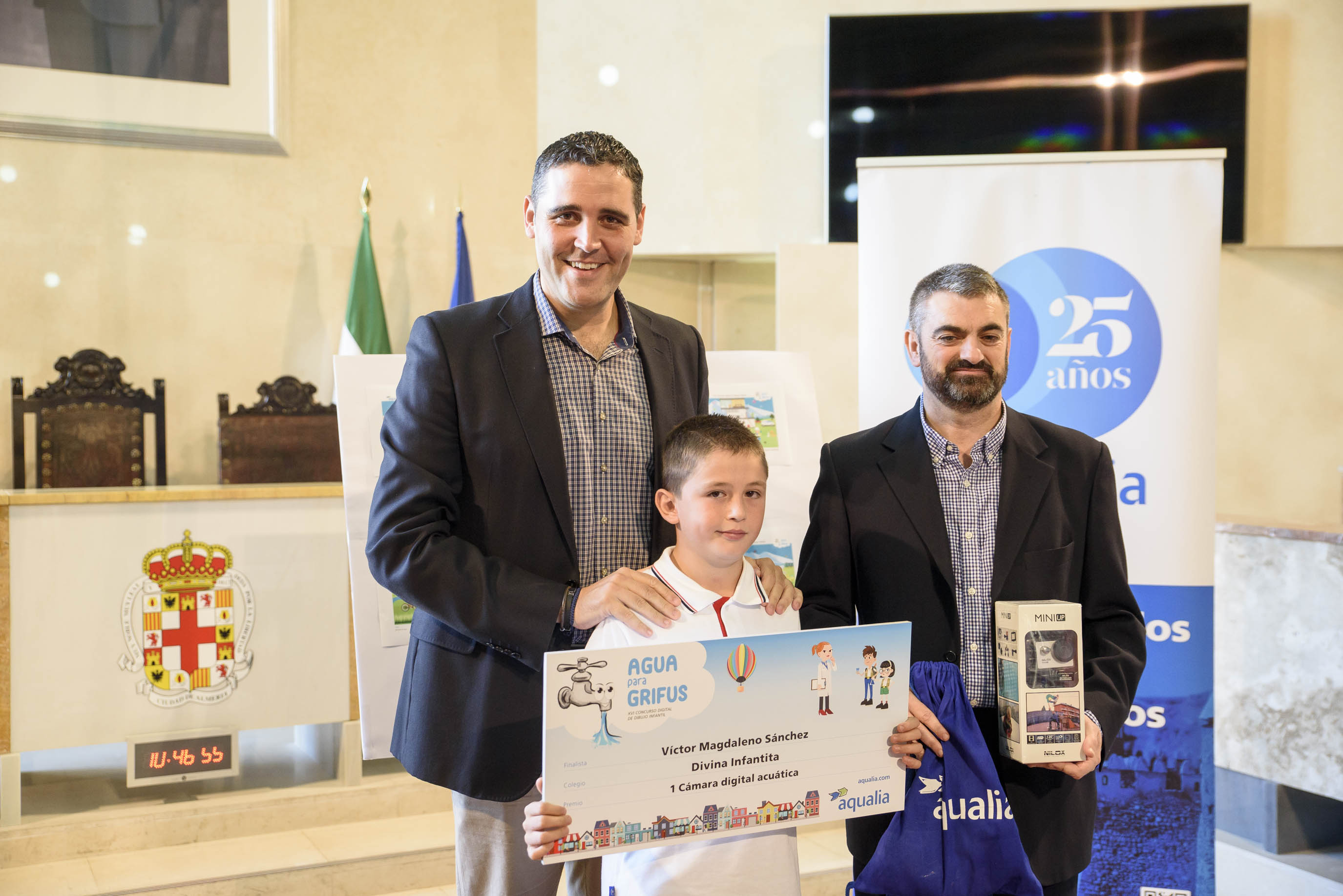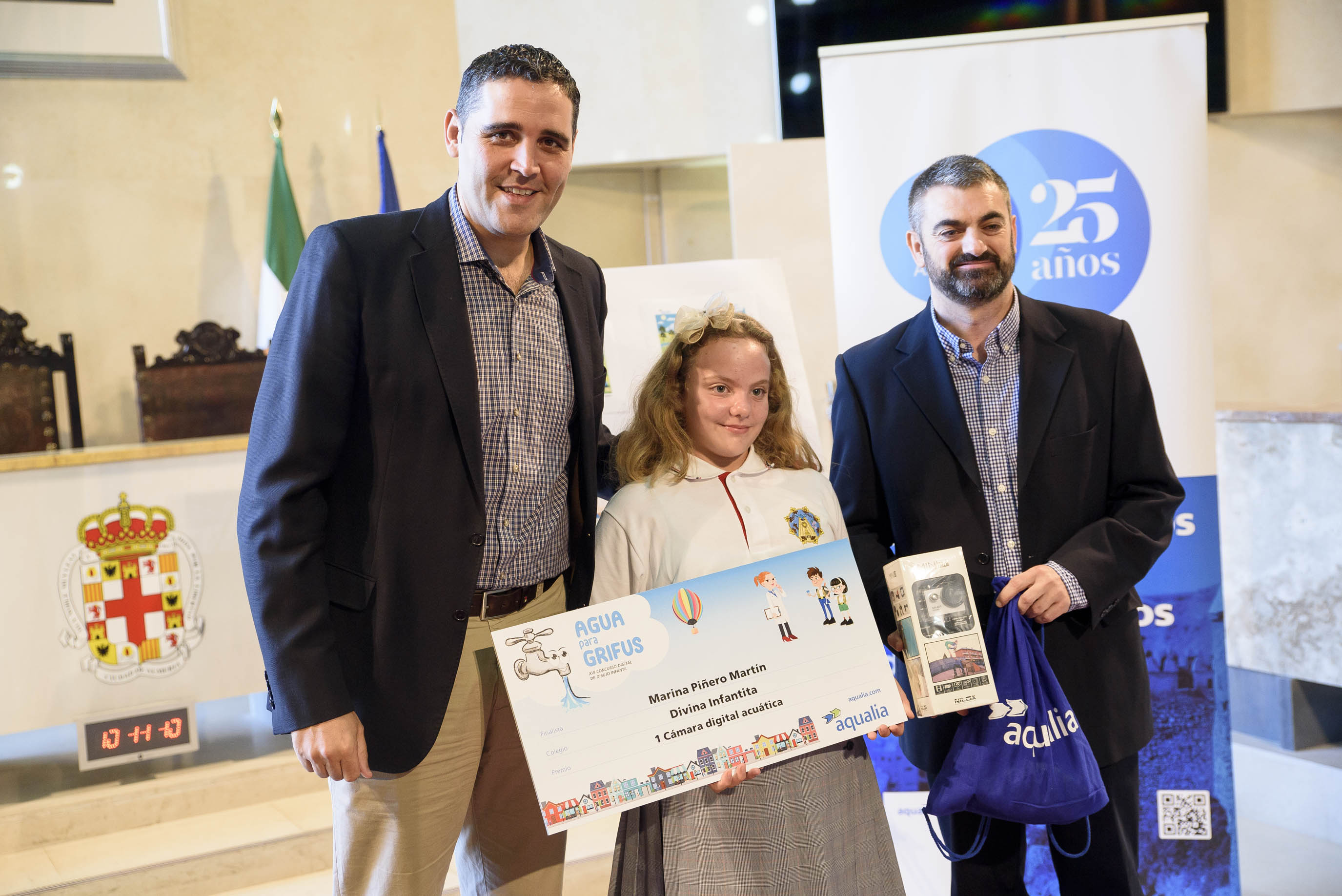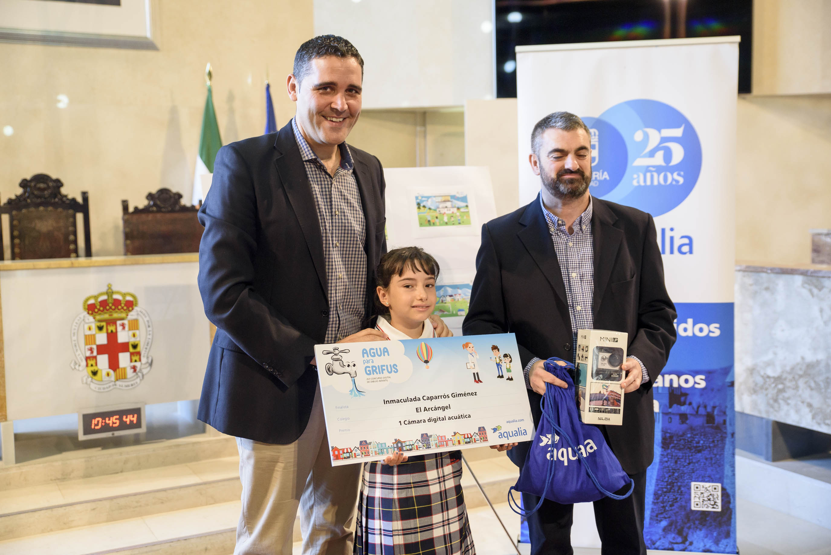 El concejal de Servicios Municipales de Almería, Juan José Alonso, y José V. Colomina, gerente de Aqualia en la ciudad, han hecho entrega esta mañana de los premios correspondientes a la 16ª Edición del Concurso Digital Infantil que la empresa ha lanzado este año en torno al microsite www.aguaparagrifus.com con la intención de poner en valor el trabajo que representa llevar el agua desde la naturaleza hasta el grifo.