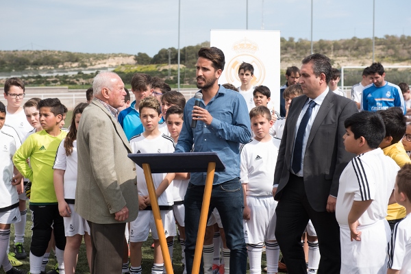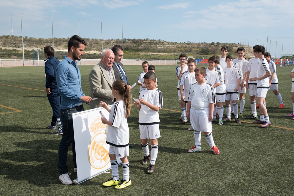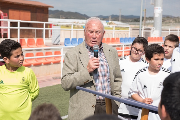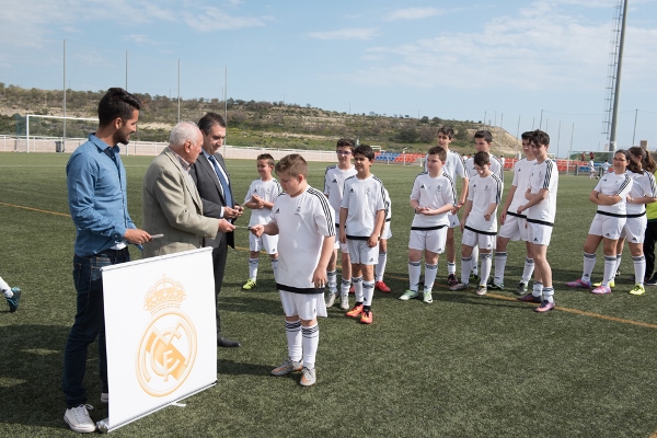 La actividad es posible gracias a un acuerdo entre el club madrileño, la empresa Aqualia y el Ayuntamiento de Mazarrón. Este miércoles los alumnos que se forman semanalmente en el Complejo Deportivo recibieron la visita de una delegación de la Fundación Real Madrid encabezada por Agustín Herrerín, delegado de campo del Estadio Santiago Bernabéu quien dedicó unas cariñosas palabras de aliento a los niños.