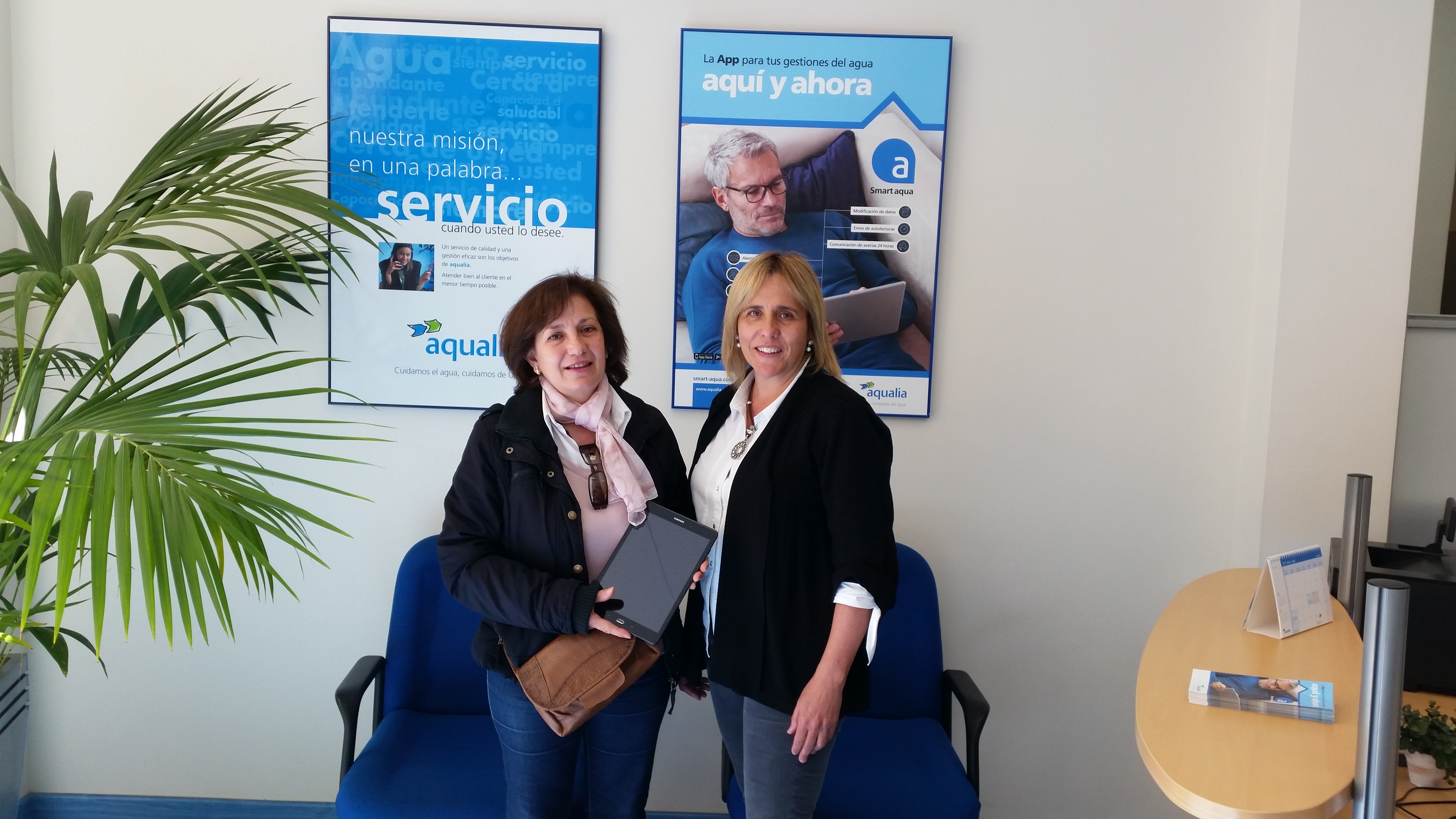 La jefa de servicio de Aqualia en la localidad, Lola López Godoy, junto a Ángel Rosado, de atención al cliente, le han entregado la Tablet a Mercedes Demetrio Romero, que ha sido agraciada a través del contrato de agua de su empresa, Rondalavi, S.L. y ha indicado que “me he pasado a la e-factura por comodidad y por el medioambiente”.