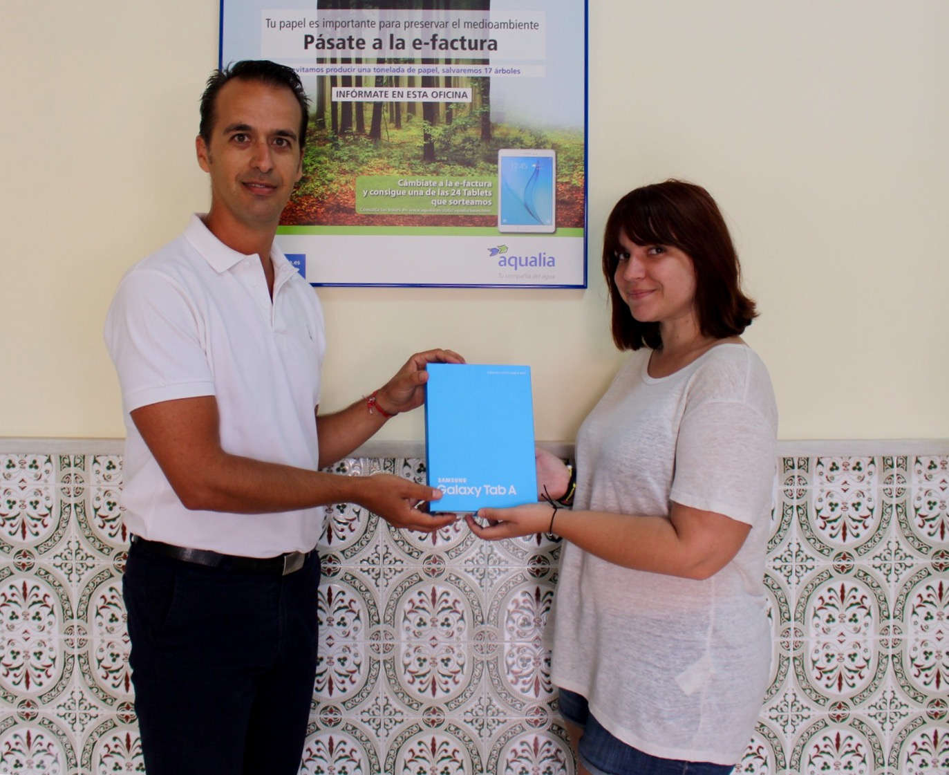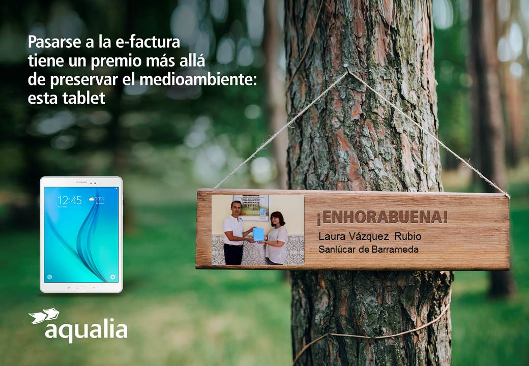 Laura Vázquez Rubio, cliente de Aqualia en Sanlúcar de Barrameda ha sido una de las dos primeras premiadas por la Campaña “Pásate a la e-factura” lanzada por Aqualia. La campaña tiene como objetivo aumentar el número de clientes que reciben la factura electrónica en lugar de la factura tradicional en papel. El objetivo de Aqualia es lograr, en el plazo de un año, 1 millón de facturas electrónicas adicionales.